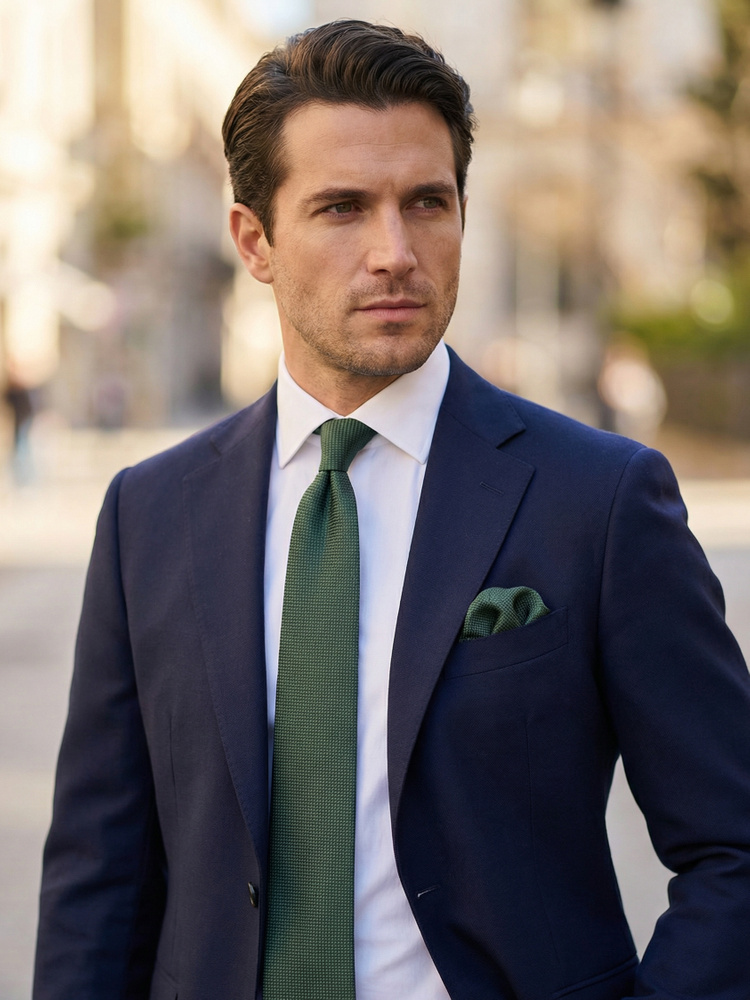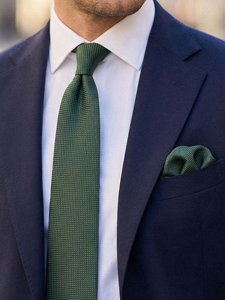 Тъмнозелена вратовръзка и кърпичка за сако