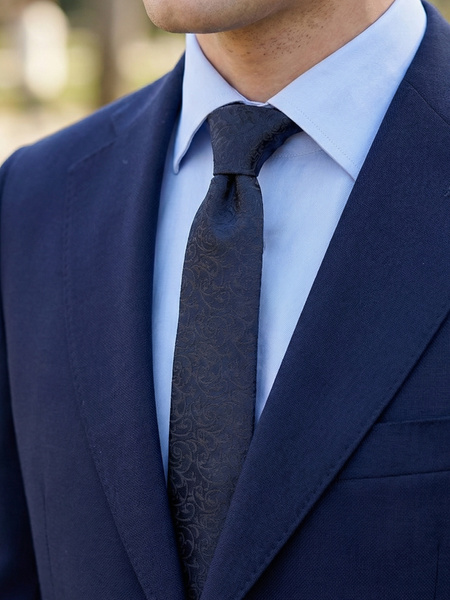 Mørkeblå smalt slips med et stilrent sildebensmønster, der passer fint til de fleste outfits. Slipset er syet i hånden i Italien af 70% uld og 30% silke og er det rigtige valg for dig, der ønsker den allerbedste kvalitet. Uld har en mat og varm farvetone, der er særdeles velegnet til efterår og vinter. Dette slips er dog lige så velegnet til at have på året rundt.