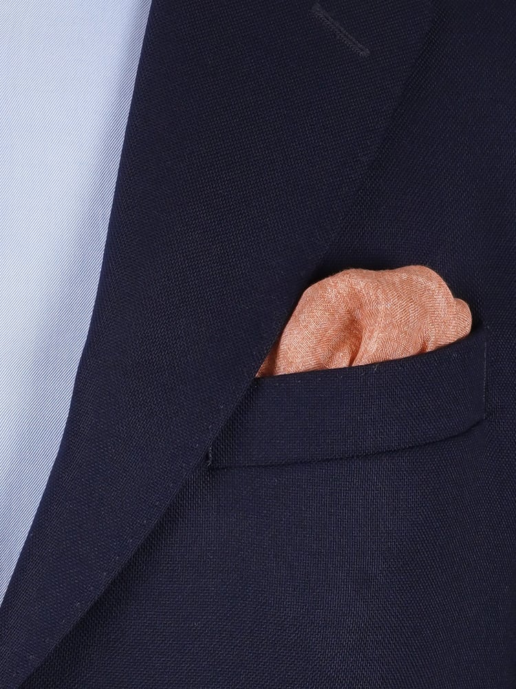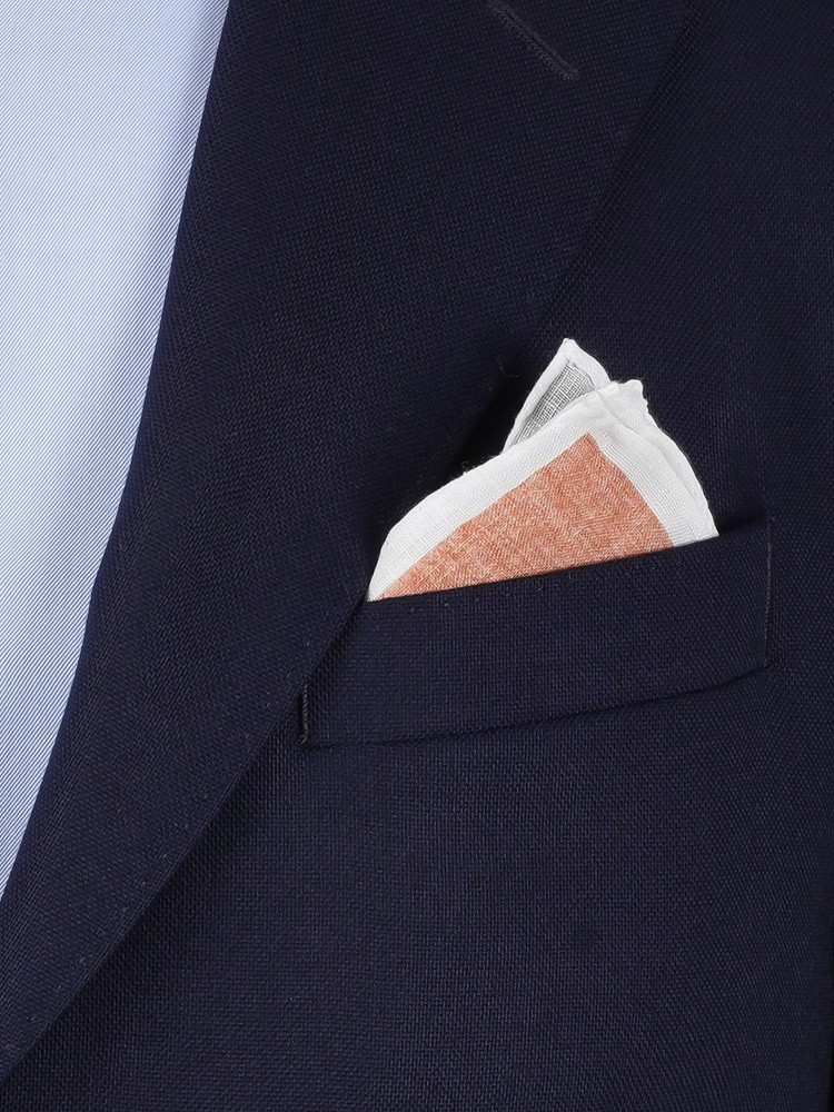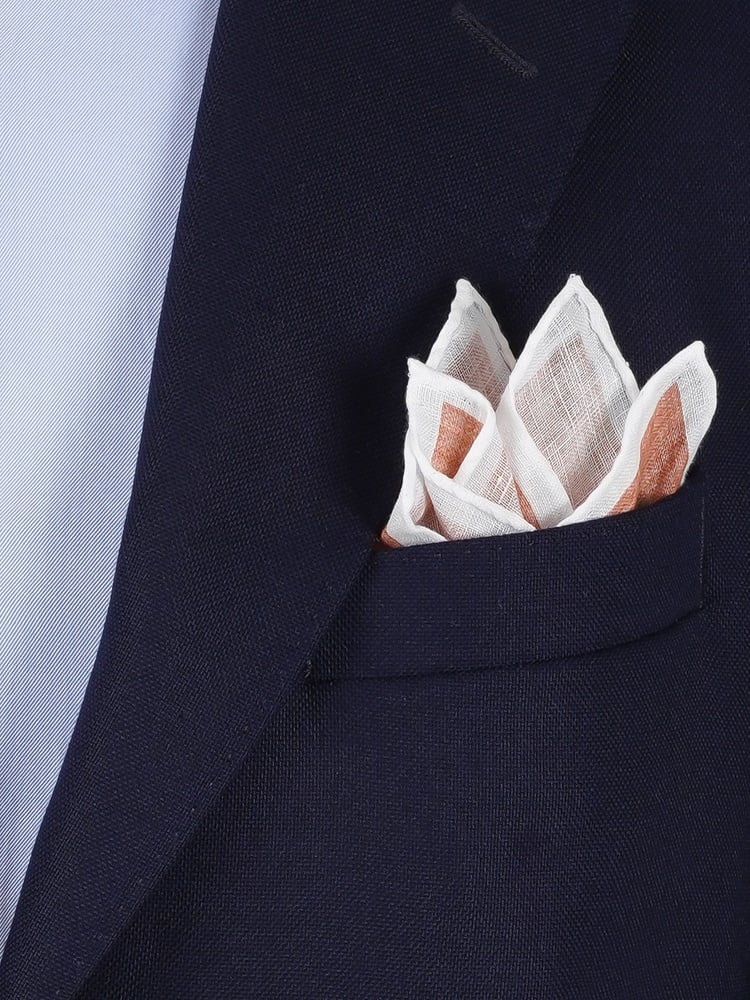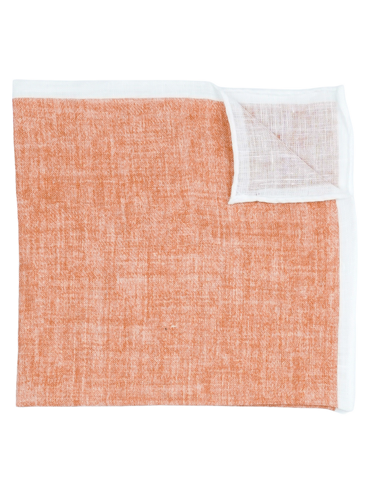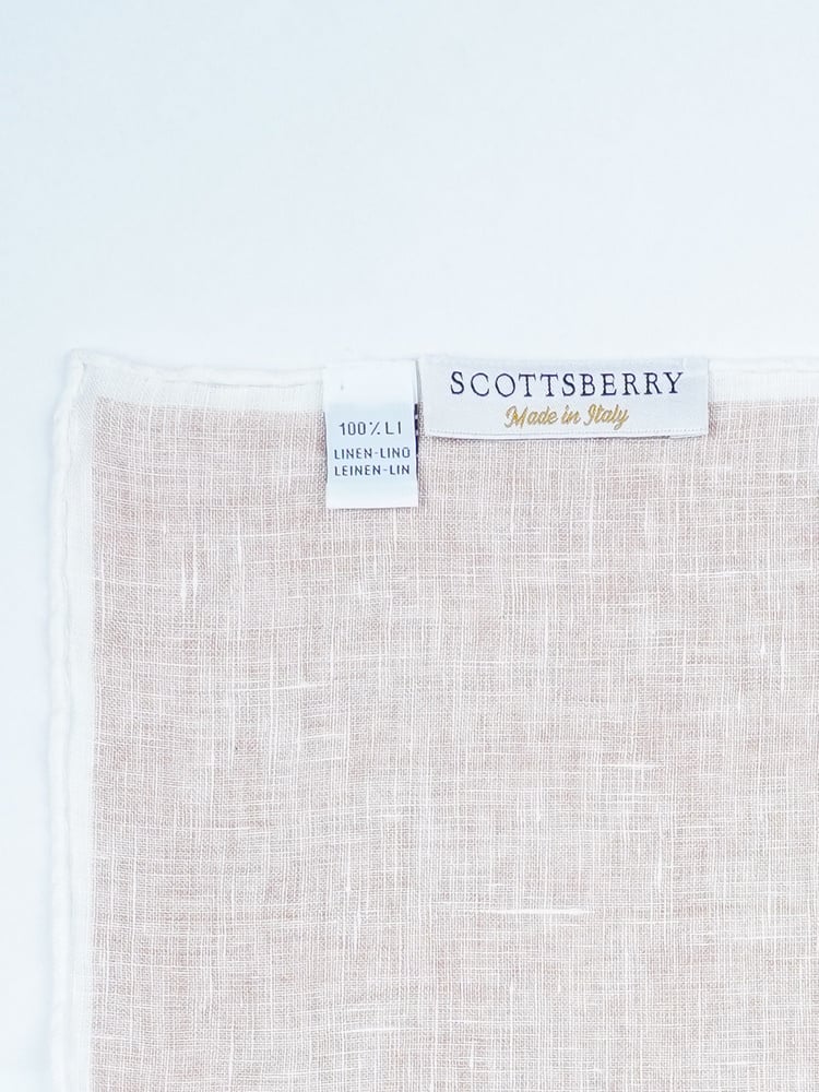 A light brown handkerchief in 100% linen with a white contrast edge. The fabric is woven in Como, Italy, at a weaving mill with more than a century of craftsmanship. The natural character of the linen and the light brown tone create a soft, elegant expression. A versatile accessory that suits both formal and relaxed occasions.