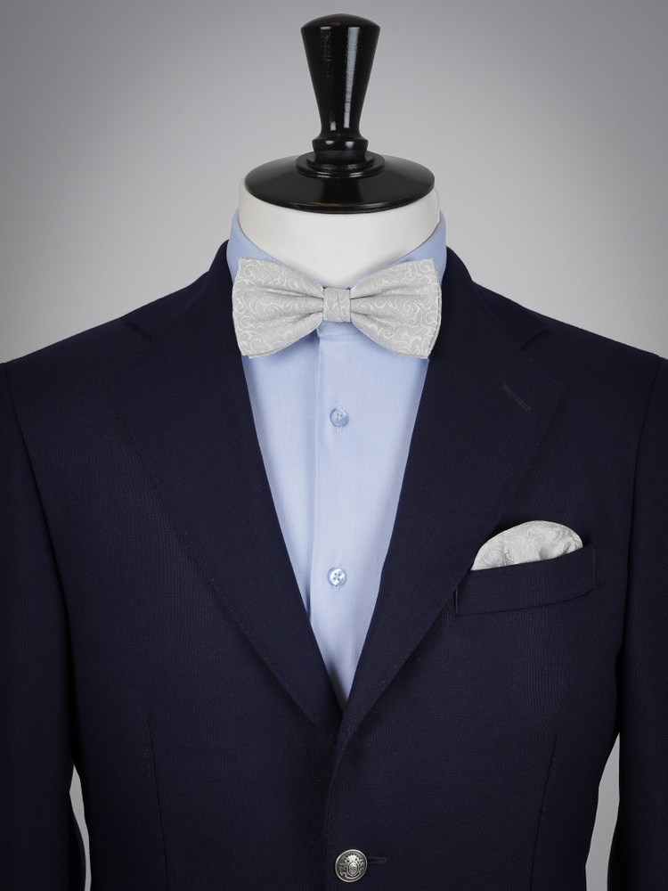 Tämä vaaleanhopea silkkinen rusettien ja taskuliinan setti on koristeltu elegantilla arabeski-kuviolla, joka antaa juhlapukeutumiseen hienostuneen hehkun – täydellinen viimeistely esimerkiksi hääasuun. Rusetti on valmiiksi sidottu ja käsin huolellisesti ommeltu Italiassa mestariräätälien toimesta, kun taas taskuliina on viimeistelty sekä kone- että käsinommellen ylellisen lopputuloksen varmistamiseksi. Molemmat osat on valmistettu korkealaatuisesta silkistä, joka on kudottu Comossa perinteikkäässä, yli satavuotisen historian omaavassa perheomisteisessa kutomossa.