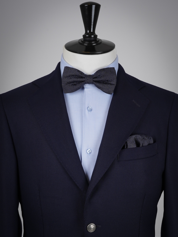 Tämä laivastonsininen silkkinen solmuke- ja taskuliinasetti hurmaa hienostuneella mustalla arabeskkikuviollaan – täydellinen valinta häihin ja muihin juhlaviiin tilaisuuksiin. Solmuke on valmiiksi sidottu ja huolellisesti käsin ommeltu Italiassa kokeneiden räätälien toimesta, kun taas taskuliinan viimeistelyssä yhdistyvät kone- ja käsityö, mikä takaa ylellisen viimeistelyn. Molemmat osat on valmistettu Comossa kudotusta, perheomisteisen kutomon yli satavuotista perinnettä vaalivasta ensiluokkaisesta silkistä.
