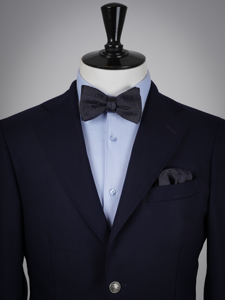 Tämä tyylikäs setti sisältää itse solmittavan rusettin ja siihen täydellisesti sopivan taskuliinan, molemmat tummansinisestä arabeskuvikkuisesta silkistä. Ylellinen silkki on kudottu Comossa, Italiassa, ja jokainen yksityiskohta on viimeistelty käsityönä taitavien räätälien toimesta. Lopputuloksena on ajattoman elegantti asustepari, joka viimeistelee juhla- ja häätyylin hienostuneella tavalla.