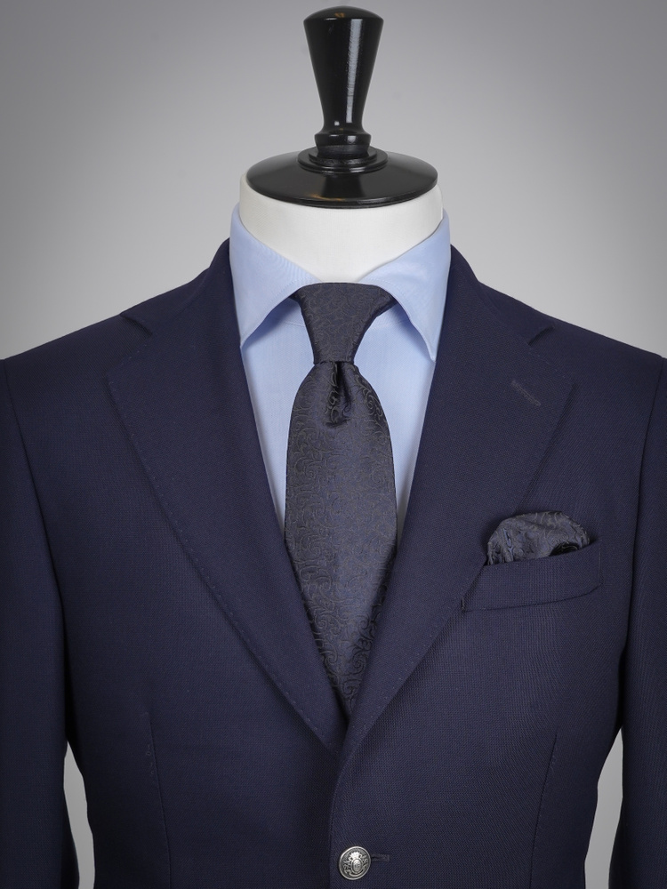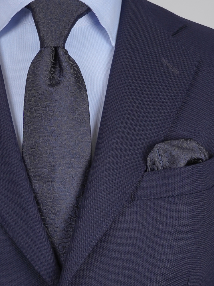Tämä laivastonsininen solmio- ja taskuliinasetti huokuu ajatonta eleganssia, täydellinen valinta häihin ja juhlavampiin tilaisuuksiin. Molemmat asusteet on valmistettu 100 % silkistä ja kudottu Comossa, Italiassa, arvostetussa kutomossa, jolla on lähes vuosisadan kokemus hienoimpien silkkikankaiden valmistuksesta. Solmiossa on hienostunut musta arabeski-kuvio syvänsinisellä pohjalla, ja taskuliina täydentää kokonaisuuden tyylikkäällä, yhteensopivalla designilla. Jokainen yksityiskohta on viimeistelty italialaisten räätälien käsin, mikä takaa poikkeuksellisen laadun ja ylellisen tuntuman.