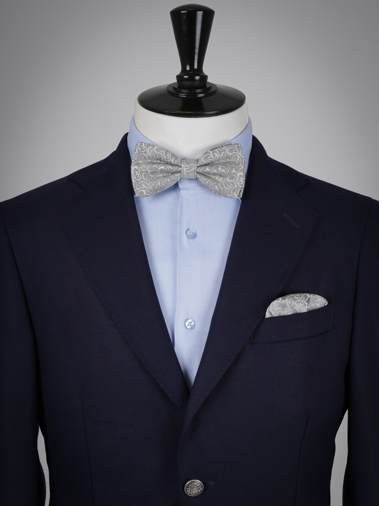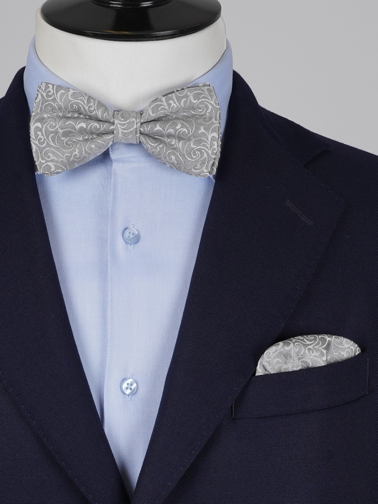 Tämä silkkinen hopeanvärinen rusetti ja taskuliina muodostavat tyylikkään kokonaisuuden, jota koristaa hienostunut arabeski-kuvio. Setti huokuu eleganssia ja eksklusiivisuutta – täydellinen valinta häihin ja juhlavampiin tilaisuuksiin. Rusetti on esisidottu ja ommeltu käsin Italiassa mestariräätälien toimesta, kun taas taskuliina viimeistellään sekä kone- että käsinompelulla, jotta lopputulos on äärimmäisen huoliteltu. Molemmat osat on valmistettu korkealaatuisesta Comossa kudotusta silkkikankaasta, jonka takana on yli vuosisadan mittainen käsityöperinne.