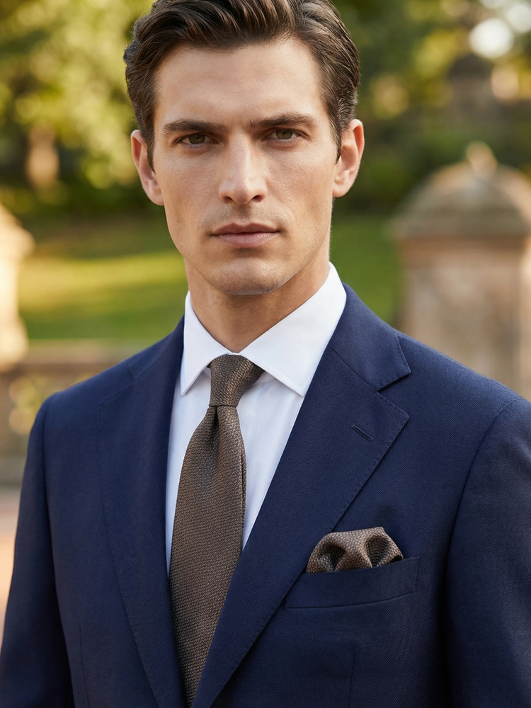 Sötétbarna selyem nyakkendő grenadine díszzsebkendővel