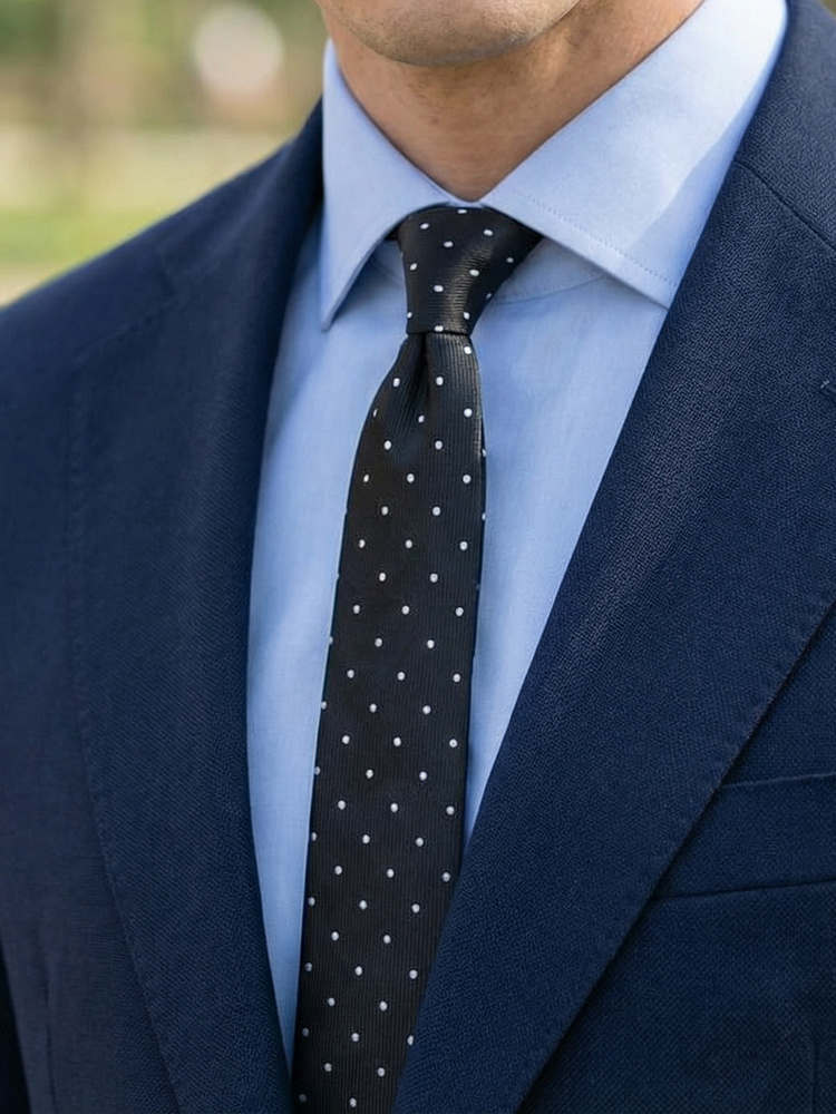 Skinny black tie with white dots sewn by hand in 100% silk. With a focus on stylish design and perfect cuts, we have developed a timeless tie that is suitable to wear on many different occasions. Without intermediaries, we can keep prices down without compromising on quality. The back of the tie is sewn throughout in the same silk fabric, which is called self-tipping. The inner lining is a wool blend to give the tie a nice knot and good fall.