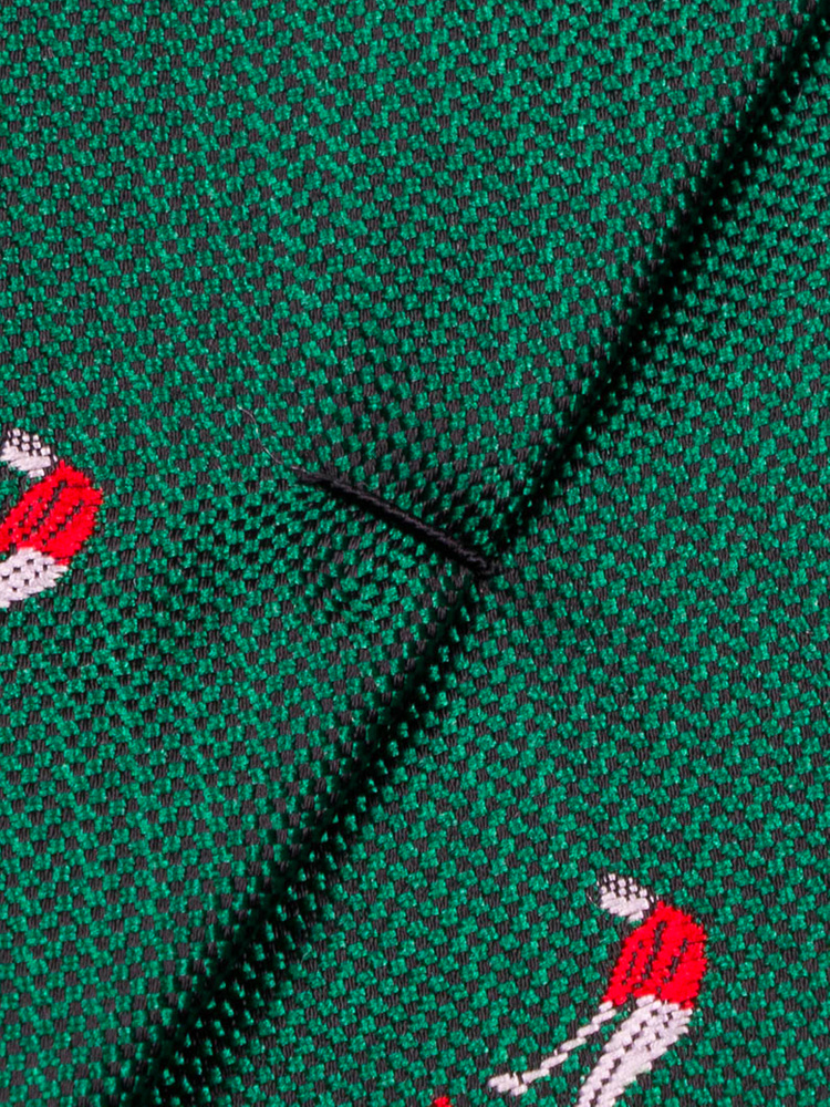 A green tie with motifs of a golfer. The tie is 7 cm wide and is sewn in durable polyester. Made by hand without intermediaries. Store the tie loosely rolled up or hanging for the longest durability. Always tie it up after use. Swedish design.