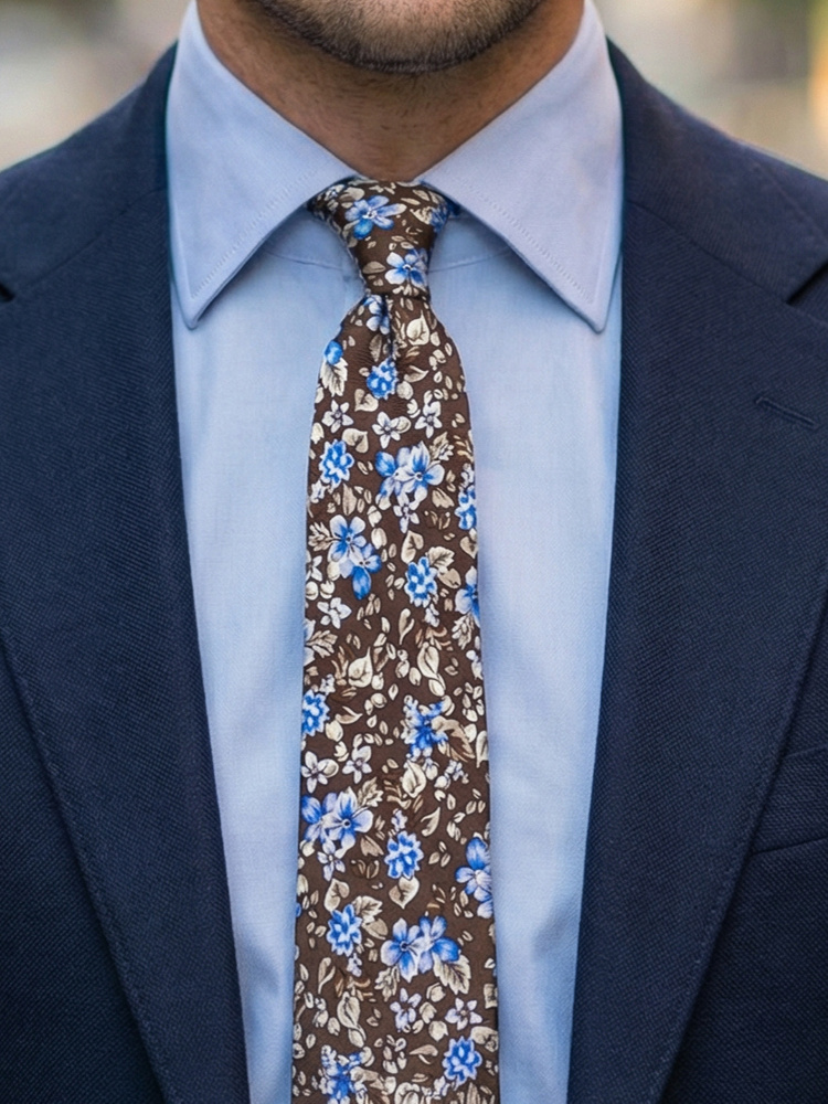 Wąski krawat w kwiatowy wzór, wykonany w 100% z jedwabiu. Ręcznie szyty, z precyzyjnym cięciem i wzmocnionymi szwami. Wełniana podszewka zapewnia elegancki opad i węzeł. Tył z tego samego jedwabiu, tzw. Self-tipping.