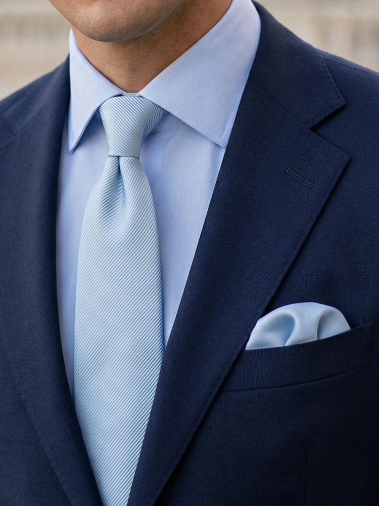 Cravată îngustă albastru foarte deschis și batistă de buzunar