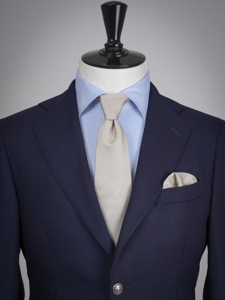 Detta set med beige grenadinslips och näsduk ger en tidlös elegans till varje outfit och tillfälle. Båda delarna är tillverkade av 100 % siden och vävda i Como, Italien, hos ett väveri med nästan ett sekel av textilkunskap. Grenadinväven skapar en diskret struktur och ett sofistikerat djup i tyget, vilket gör detta mångsidiga set lika passande för formella som mer avslappnade sammanhang. Varje del är noggrant handsydd av italienska skräddare – en perfekt balans mellan precision och genuint hantverk som utstrålar diskret lyx.