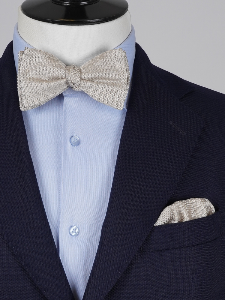 Detta sofistikerade set består av en oknuten fluga och en matchande näsduk i beige siden med grenadinväv – en tidlös textur som utstrålar elegant mångsidighet. Båda delarna är tillverkade av exklusivt siden vävt i ett väveri i Como, Italien, och är handsydda av skickliga skräddare för att komplettera varje outfit och tillfälle.