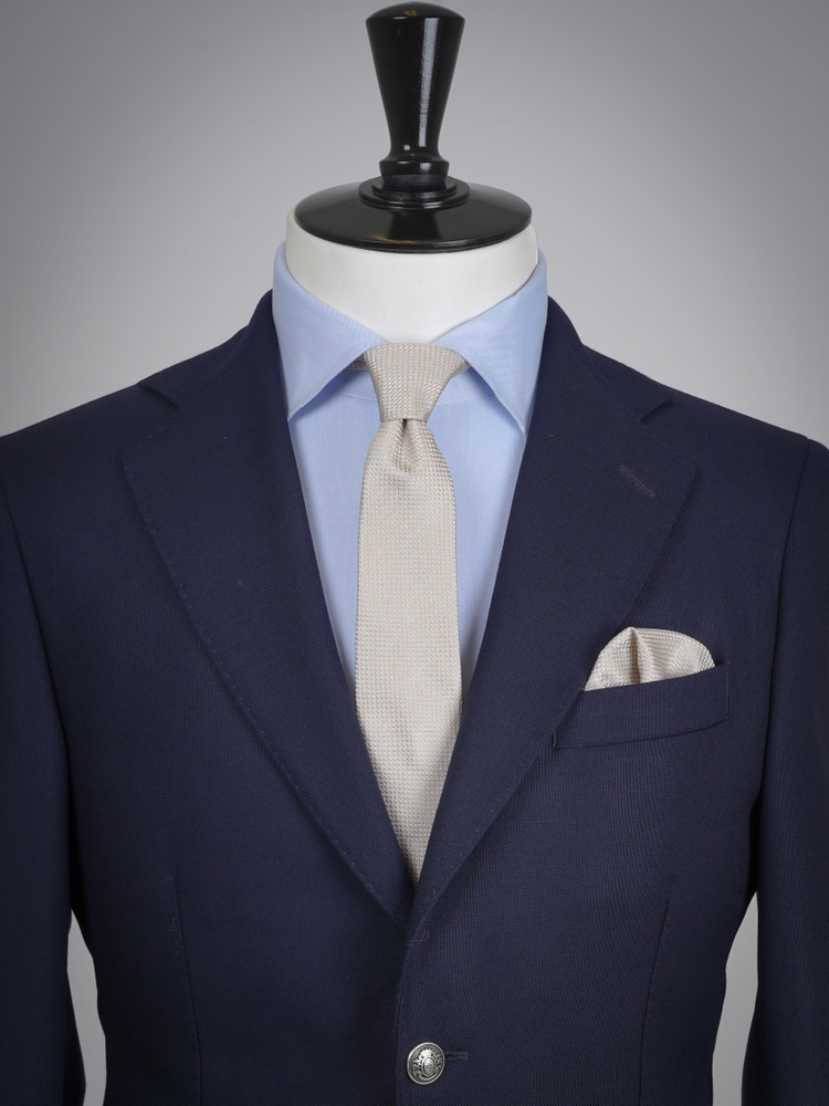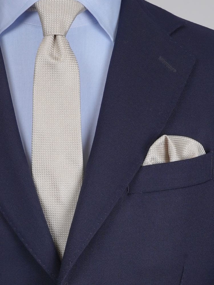 Detta beigeset i siden består av en smal slips och en matchande näsduk, båda vävda i en exklusiv grenadinstruktur som ger ett elegant djup och en sofistikerad textur. Tyget är vävt i Como, Italien, av ett väveri med nästan hundra års tradition och varje del är handsydd av italienska hantverkare. Resultatet är ett set som utstrålar precision, tidlös stil och förfinad elegans – den perfekta detaljen i en professionell garderob.