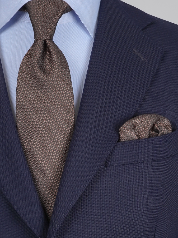 Detta mörkbruna grenadinslips- och näsduksset utstrålar diskret elegans och lyfter varje outfit och tillfälle. Båda delarna är tillverkade av 100 % siden och vävda i Como, Italien, hos ett väveri med nästan hundra års hantverkstradition. Grenadinväven ger tyget en subtil struktur och ett lyxigt djup, vilket gör setet lika passande för formella som avslappnade tillfällen. Varje del är noggrant handsydd av erfarna italienska skräddare för en perfekt finish och genuint italienskt hantverk.