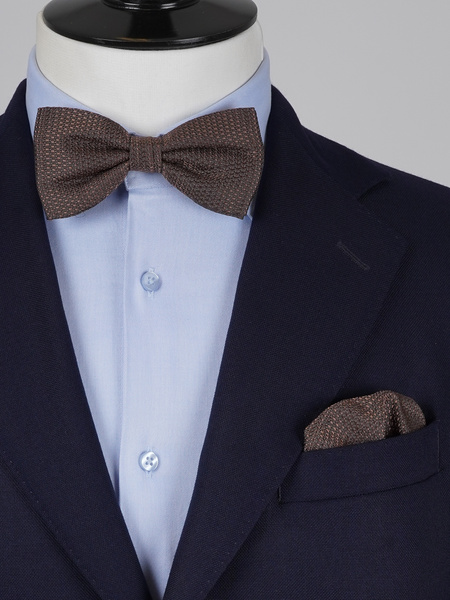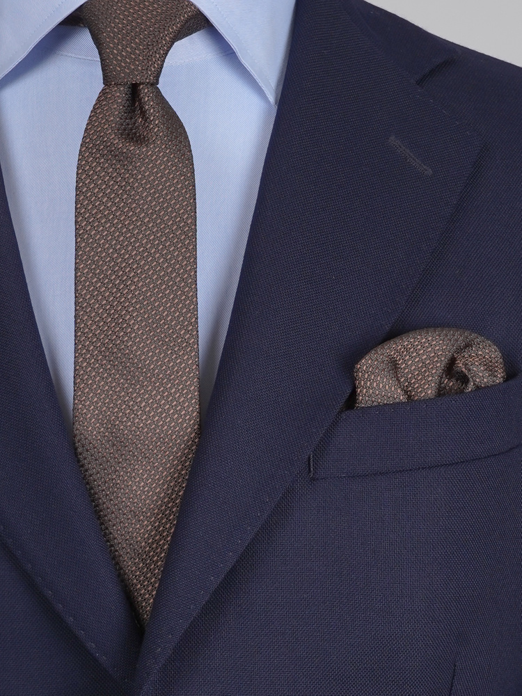 Detta mörkbruna set i siden består av en smal slips och en matchande näsduk, båda vävda i en grenadinstruktur som ger tyget djup och karaktär. Tyget är tillverkat i Como, Italien, av ett anrikt väveri med nära hundra års hantverkstradition, och varje detalj är handsydd av italienska mästare. Kombinationen av klassiskt hantverk och en modern slimmad silhuett gör setet till ett sofistikerat komplement till affärsstilen – diskret, elegant och tidlöst.