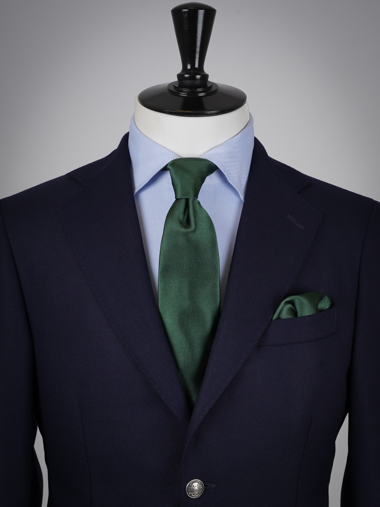 Detta klassiska set kombinerar en mörkgrön sidenslips i satin med en matchande näsduk i en tidlös, djup nyans – perfekt för bröllop och formella tillfällen. Båda delarna är handsydda i Como, Italien, med exklusivt siden från ett familjeägt väveri med nära hundra års textiltradition. Det fylliga sidnet har en slät satinväv som ger en lyxig känsla, medan slipsen har en mellanläggning i ullblandning som ger ett elegant fall och skarpa knutar.