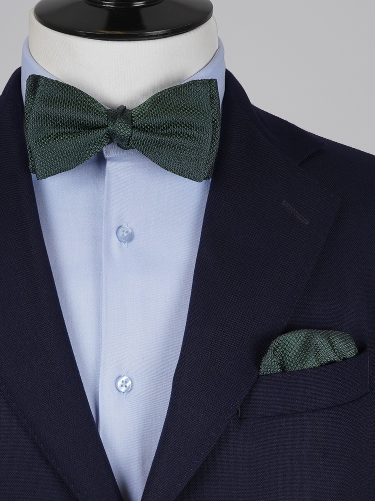 Detta tidlösa set består av en oknuten fluga och en matchande näsduk i mörkgrönt siden med grenadinväv, vilket ger en rik textur och elegant djup. Båda delarna är tillverkade av exklusivt siden vävt i ett väveri i Como, Italien, och är handsydda av skickliga skräddare – en sofistikerad detalj som lyfter varje outfit.