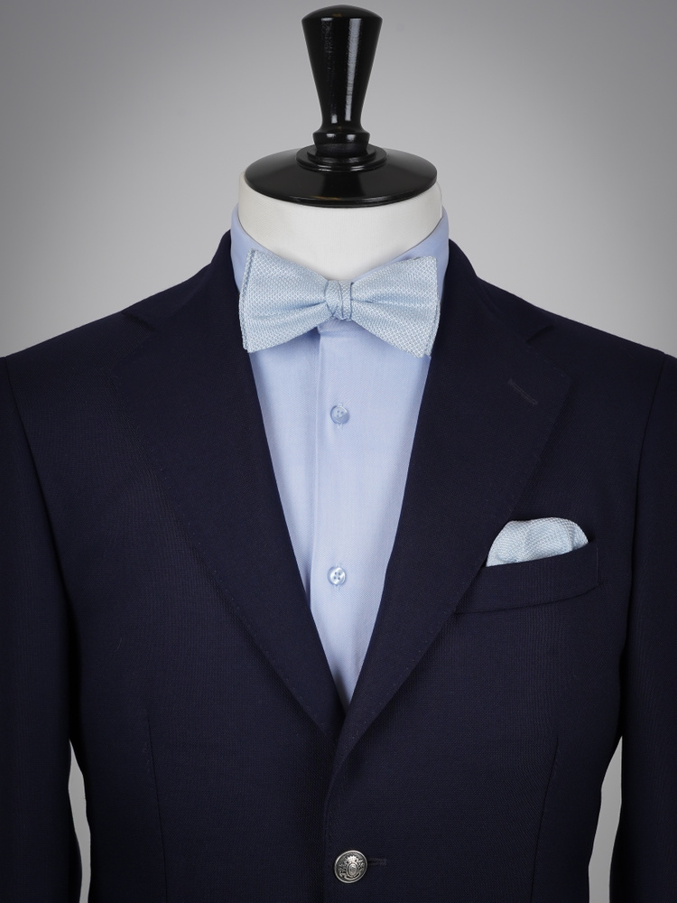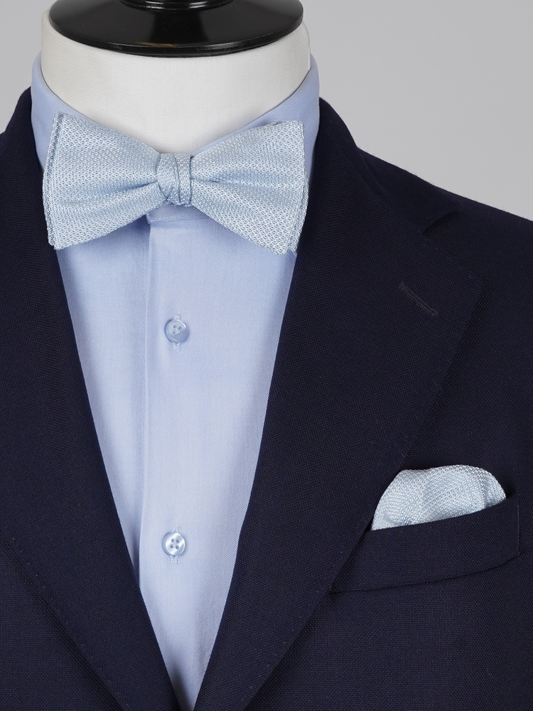 Detta tidlösa set består av en oknuten fluga och en matchande näsduk i ljusblått siden med grenadinväv, vilket ger en elegant struktur och mångsidig finess. Båda delarna är tillverkade av förstklassigt siden vävt i ett väveri i Como, Italien, och är handsydda av skickliga hantverkare – ett sofistikerat komplement till varje outfit.
