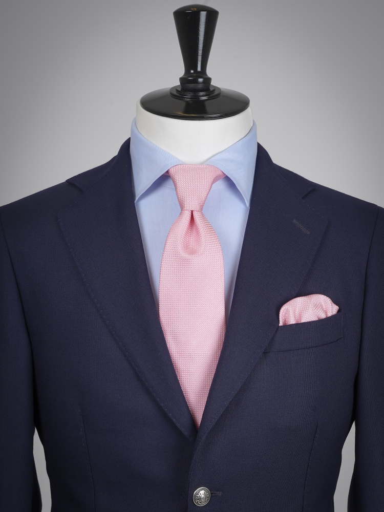Detta set med ljusrosa grenadineslips och näsduk ger en subtil romantisk ton till varje outfit. Båda delarna är tillverkade av 100 % siden och vävda i Como, Italien, hos ett väveri med nästan hundra års erfarenhet av textilkonst. Grenadineväven skapar en luftig men fyllig struktur med mjuk lyster, vilket gör detta mångsidiga set perfekt för alla tillfällen. Varje detalj är noggrant handsydd av skickliga italienska skräddare – en kombination av precision och förfinad elegans som utstrålar tidlös kvalitet.