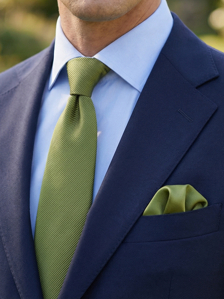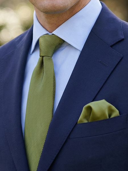 Ett lyxigt italienskt set med slips i siden och matchande näsduk i en olivgrön färg. Slipsen är handgjord i Como av exklusivt sidentyg med subtil randstruktur, vävt av ett välrenommerat familjeägt väveri. Den matchande bröstnäsduken i satin erbjuder en slät, glansig yta.