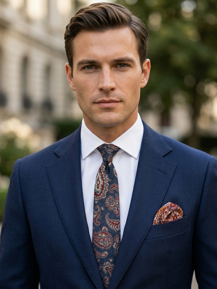 Upplev elegansen med Scottsberry's exklusiva slips och näsduk i set. Setet innehåller en mörkblå slips med vinrött paisleymönster och en tvåsidig näsduk, perfekt matchade för att bäras till både ljusa och mörka kavajer. Slipsen är tillverkad för hand i Como, Italien, från återvunnet sidentyg enligt Shappe Diamante-metoden vilket ger ett mjukare tyg med ett vackert fall. Detta gör det enkelt att knyta en estetiskt tilltalande slipsknut. Näsduken, även den i 100% Shappe diamante-siden från Italien, är burgunderröd med ett vackert mönster på framsidan och små blommor på baksidan.