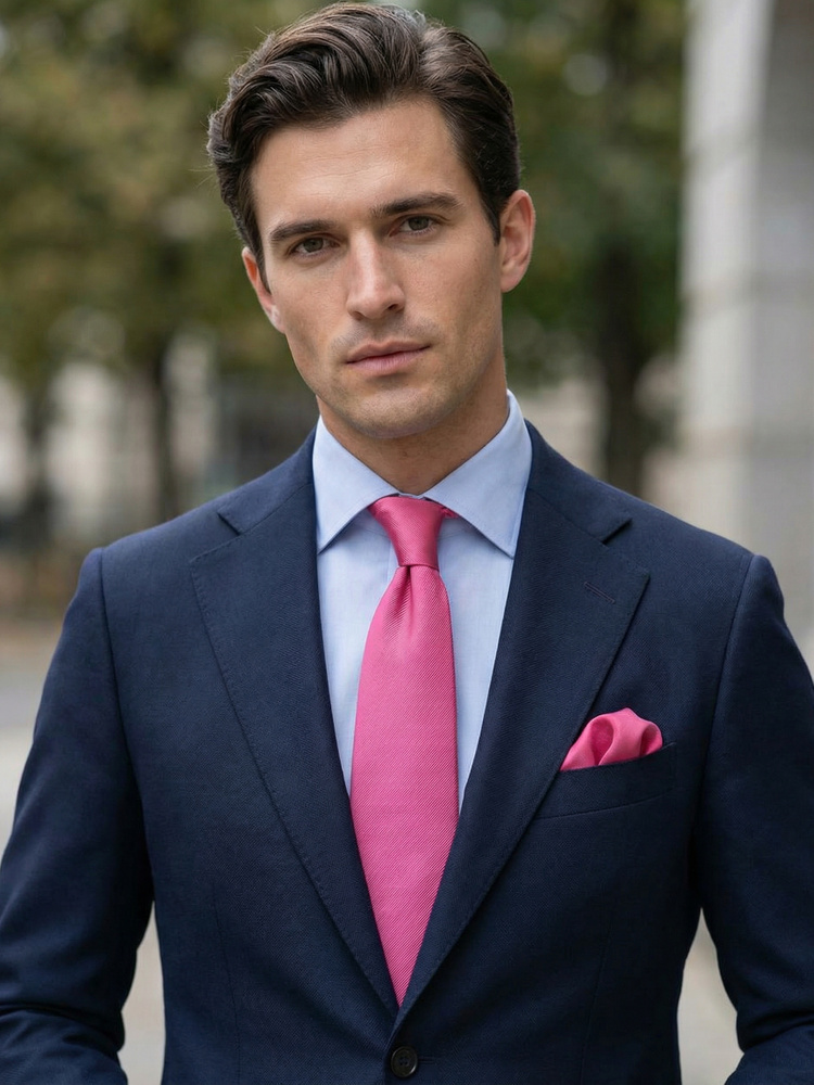Ceriserosa / mörkrosa slips och näsduk i matchande färg. Slipsen och bröstnäsduken är tillverkade för hand i 100% siden. Med noggran omsorg för detaljer och perfekta snitt håller slipsen absolut bästa klass. Utan mellanhänder kan vi hålla låga priser utan att kompromissa med kvaliteten. Slipsens baksida är tillverkad av samma sidenmaterial vilket kallas för self-tipping. Inner-materialet är tillverkat av en ullblandning för att ge slipsen en bra knut och snyggt fall.
