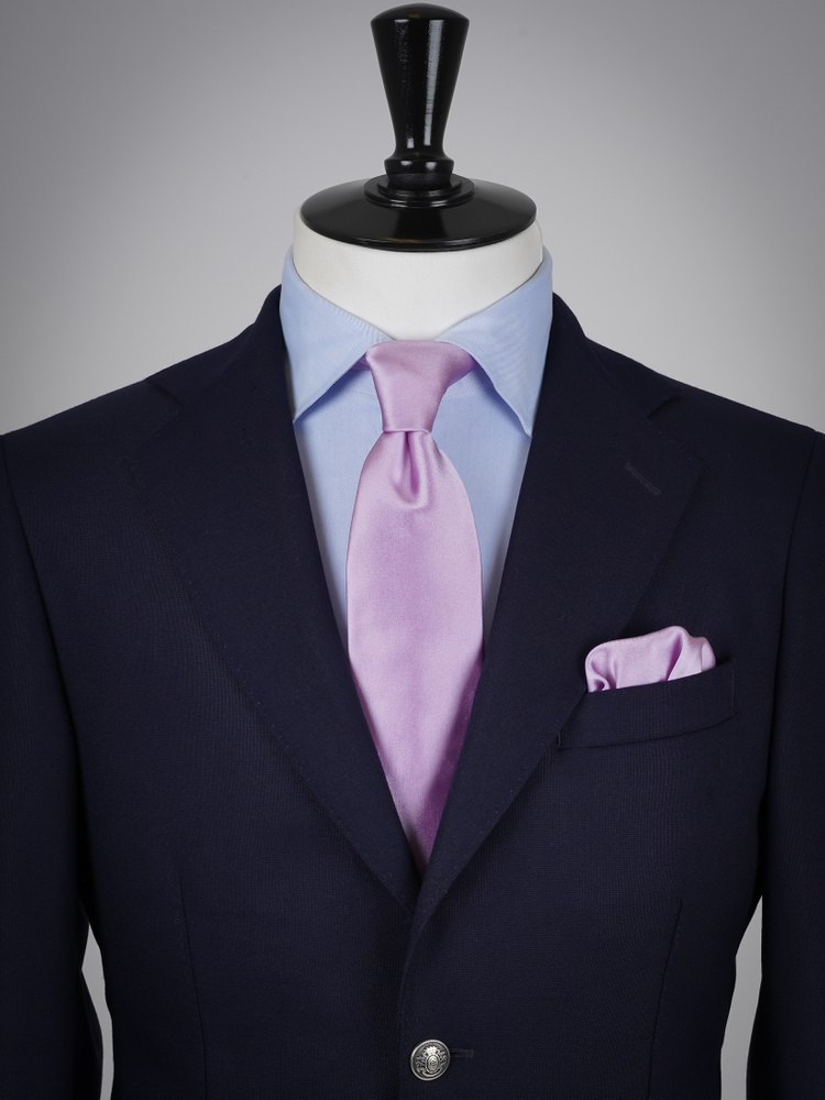 Detta eleganta bröllopsset kombinerar en mycket ljuslila sidenslips i satinväv med en matchande näsduk i en mjuk pastellton – en färg som ofta uppskattas av marskalkar och bestmen. Båda delarna är handsydda i Como, Italien, av exklusivt siden från ett familjeägt väveri med nästan hundra års textiltradition. Det fylliga, högkvalitativa sidnet har en len satinyta som ger en lyxig struktur, medan slipsen har en mellanläggning i ullblandning som ger ett elegant fall och perfekta knutar varje gång.